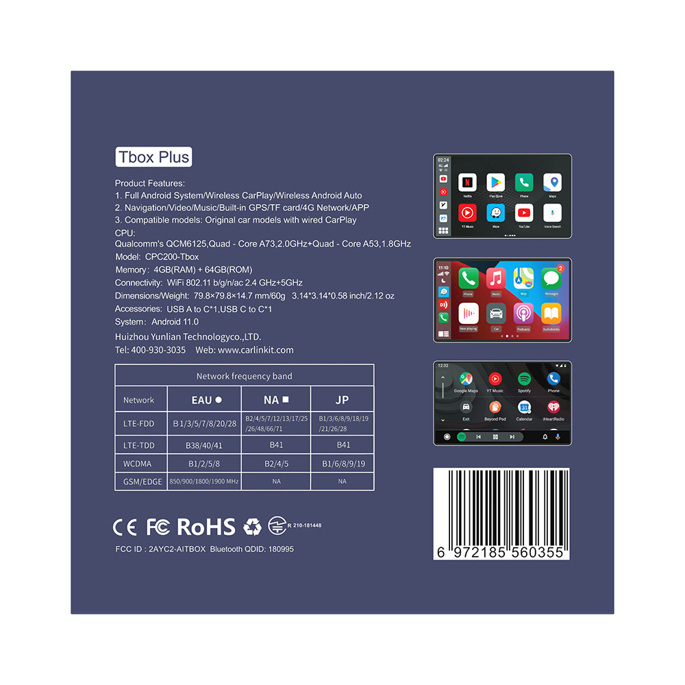 - Совместимость с автомобилями с заводским проводным Carplay/Android Auto, переключение протокола подключения к ГУ производится на Tbox согласно инструкции (в комплекте).